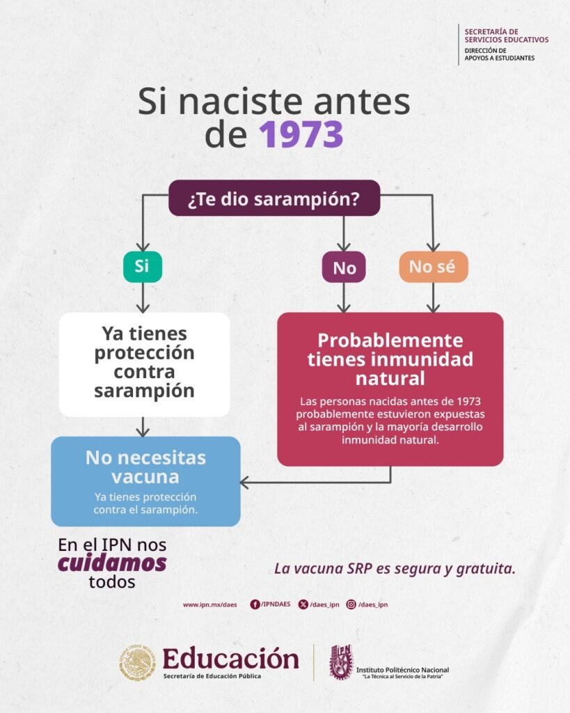 En el caso de personas nacidas antes de 1973, el IPN señala que probablemente desarrollaron inmunidad natural, debido a la alta circulación del virus en ese periodo. Sin embargo, ante cualquier incertidumbre, la orientación profesional sigue siendo clave.