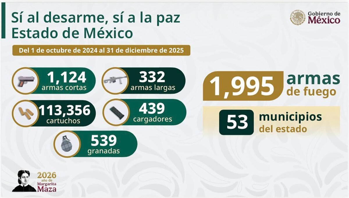 Ciudad de México, a 16 de enero de 2026.- El programa “Sí al Desarme, Sí a la Paz” ha mostrado resultados relevantes en el Estado de México, donde la ciudadanía intercambió mil 995 armas de fuego de manera anónima y voluntaria, a cambio de dinero en efectivo, en 53 municipios, durante el periodo del 1 de octubre de 2024 al 31 de diciembre de 2025.