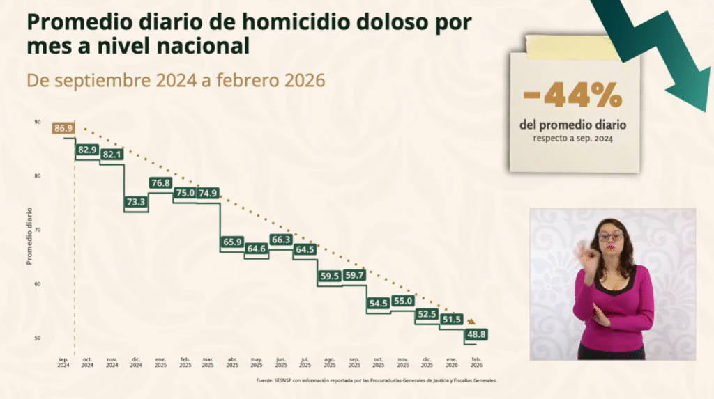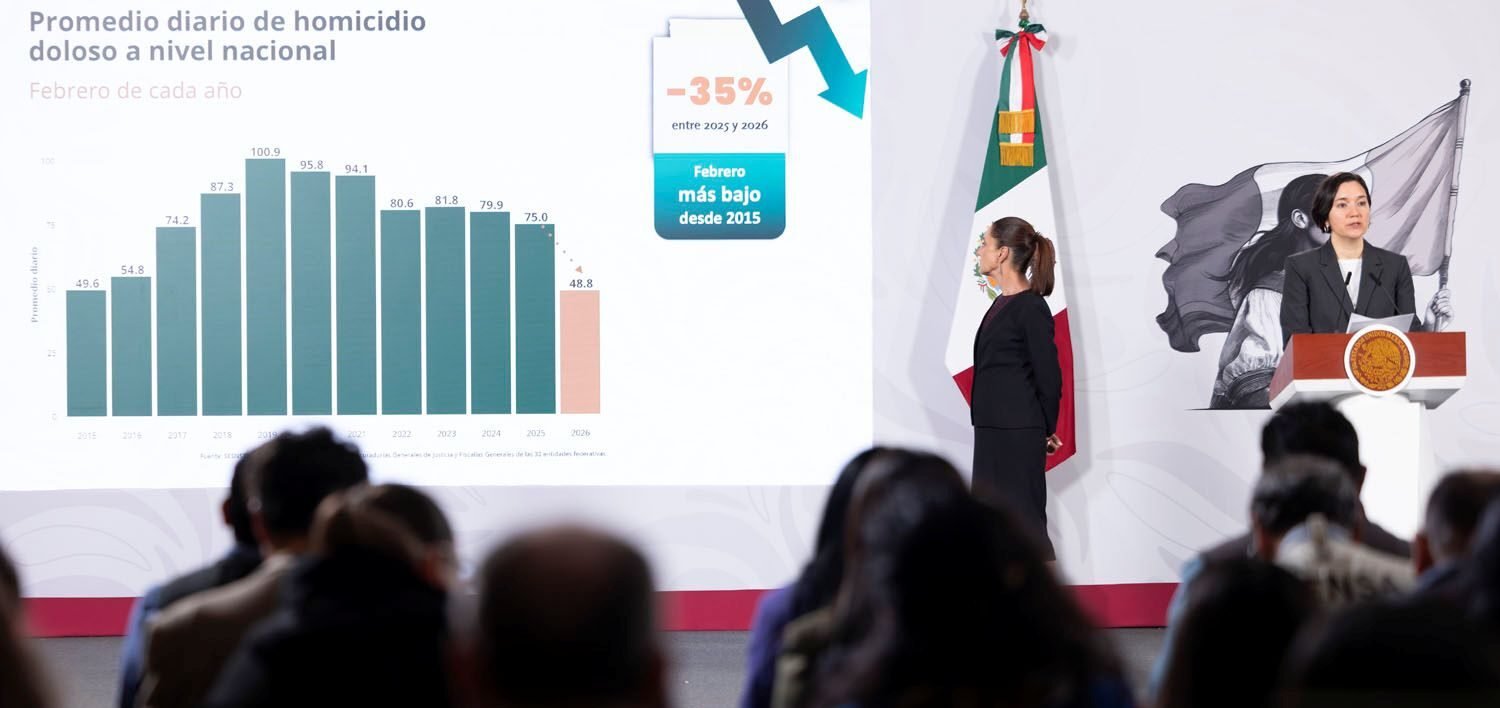 CIUDAD DE MÉXICO, a 10 de marzo de 2026.— El promedio diario de homicidios en México mostró una disminución de 44 por ciento entre septiembre de 2024 y febrero de 2026, de acuerdo con el informe presentado por el gabinete de seguridad federal.