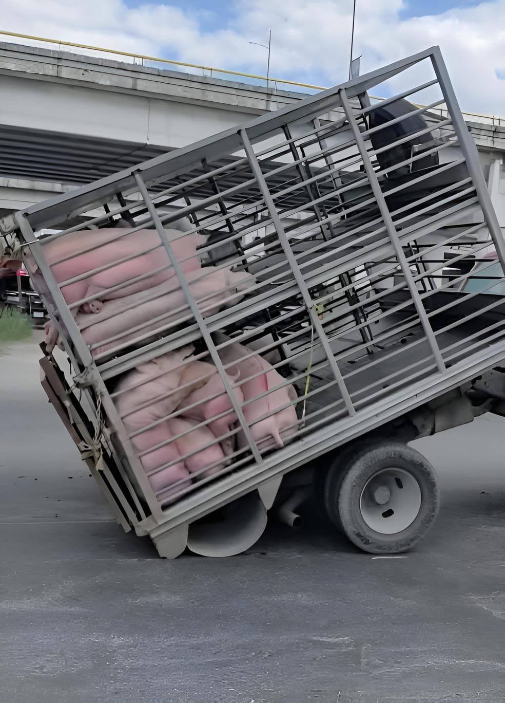 En cuestión de segundos, la estructura central se fracturó, provocando que el chasis colapsara hasta tocar el asfalto, lo que derivó en el rompimiento parcial de la caja donde eran transportados los animales.