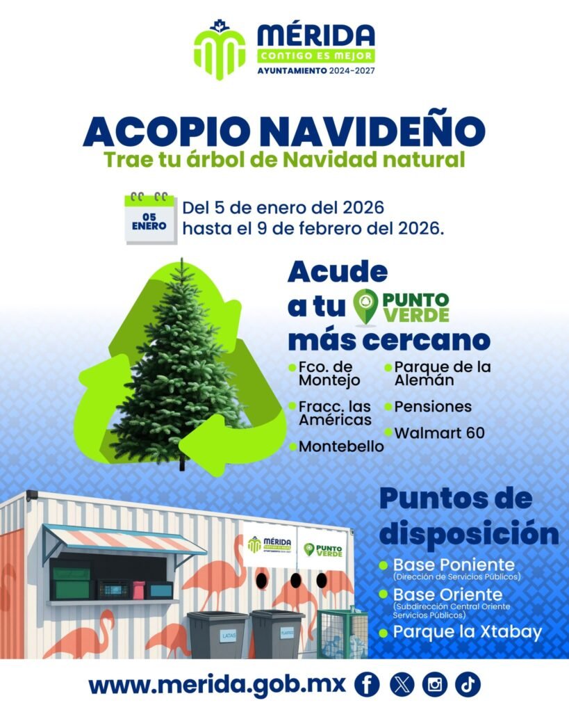 MÉRIDA, YUC, a 6 de enero de 2026.- El Ayuntamiento de Mérida puso en marcha la campaña Acopio Navideño 2026 una iniciativa que busca dar un manejo ambientalmente responsable a los árboles de Navidad naturales, una vez concluida la temporada decembrina.