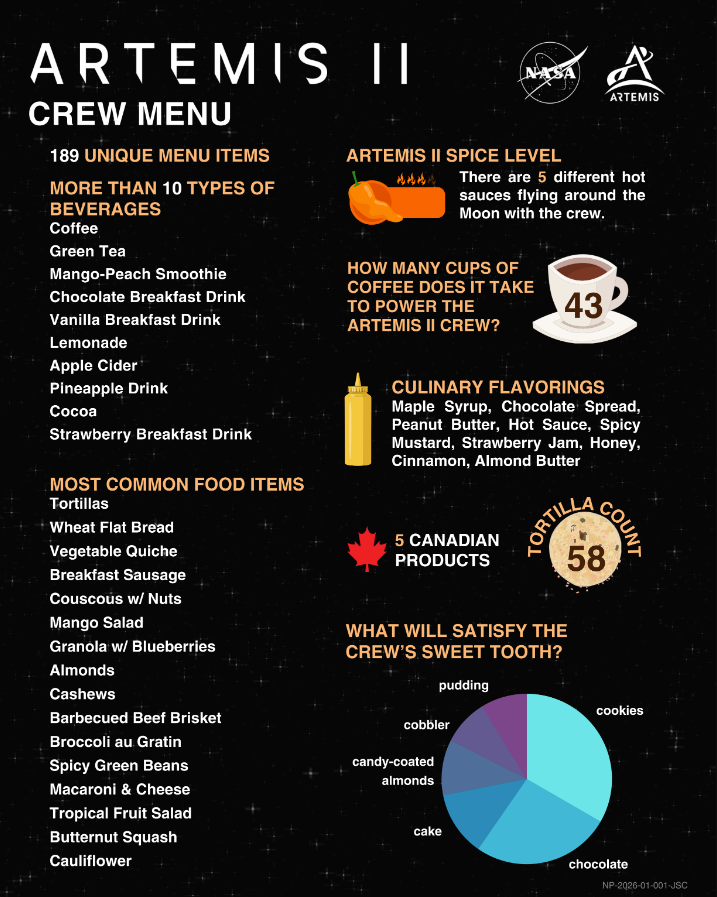 Los cuatro astronautas que participarán en el viaje de diez días alrededor de la Luna incluirán en su dieta un total de 58 tortillas, integradas dentro de un menú oficial compuesto por 189 alimentos y bebidas cuidadosamente diseñados para el entorno espacial.