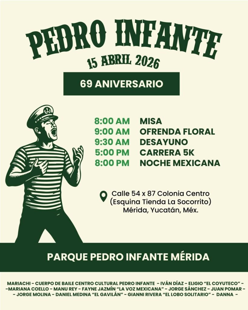 MÉRIDA, Yuc., 12 de abril de 2026.- La capital yucateca se vestirá de gala y nostalgia el próximo miércoles 15 de abril para conmemorar el 69 aniversario luctuoso de Pedro Infante Cruz, con una jornada que incluirá actividades deportivas, musicales y la presentación de un escuadrón de motociclistas en honor al ídolo del cine mexicano.