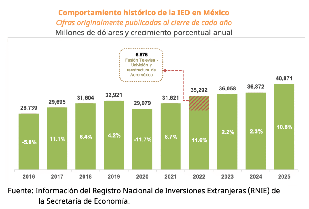 CIUDAD DE MÉXICO, a 26 de febrero de 2026.– México cerró 2025 con la cifra más alta de Inversión Extranjera Directa registrada en un año. De acuerdo con la Secretaría de Economía, el país recibió 40 mil 871 millones de dólares, lo que representa un crecimiento anual de 10.8 por ciento frente a lo originalmente publicado al cierre de 2024. Con ello, se confirma una tendencia creciente por quinto año consecutivo.