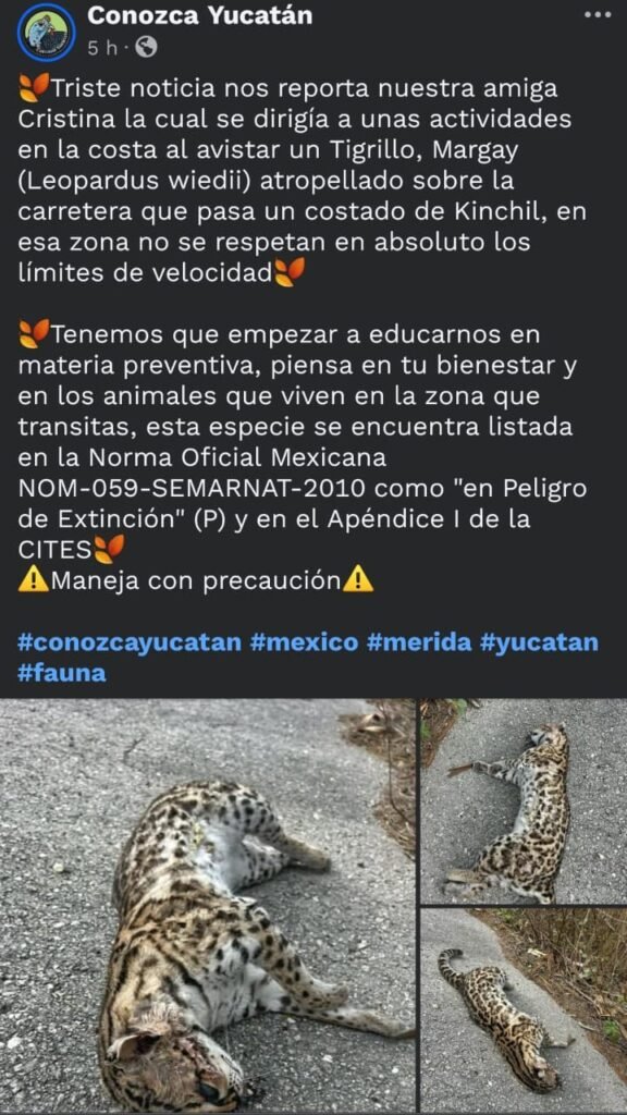 La denuncia fue realizada por Cristina Auais, a través de la cuenta Conozca Yucatán, quien al transitar por la zona avistó al felino sin vida.