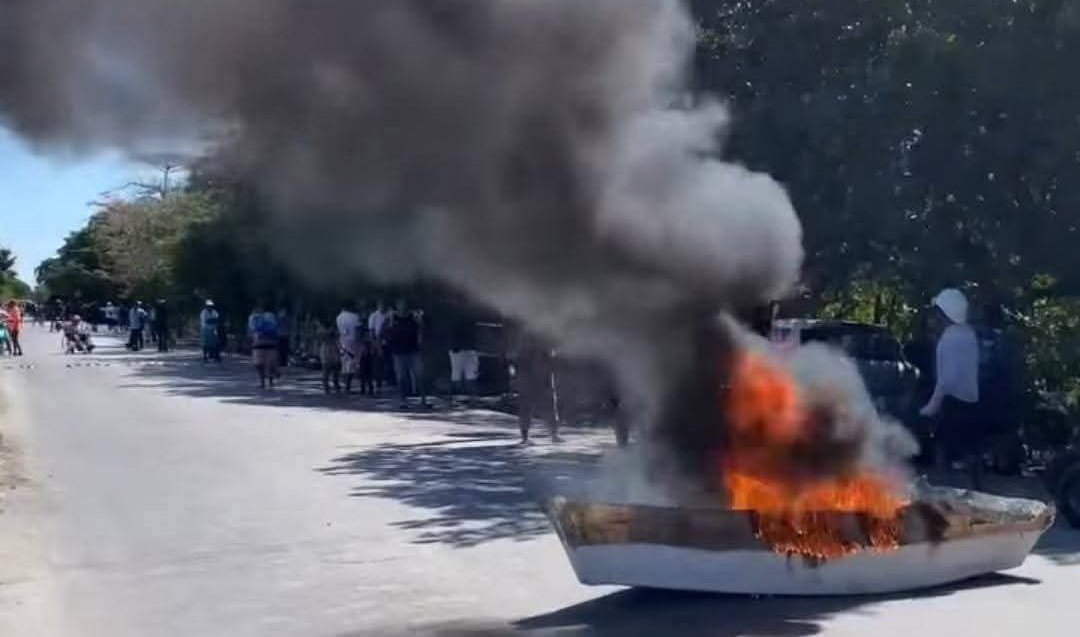 En el transcurso de la movilización, los manifestantes incendiaron una lancha de fibra de vidrio sobre el asfalto. El fuego generó una columna de humo visible en distintos puntos del puerto.