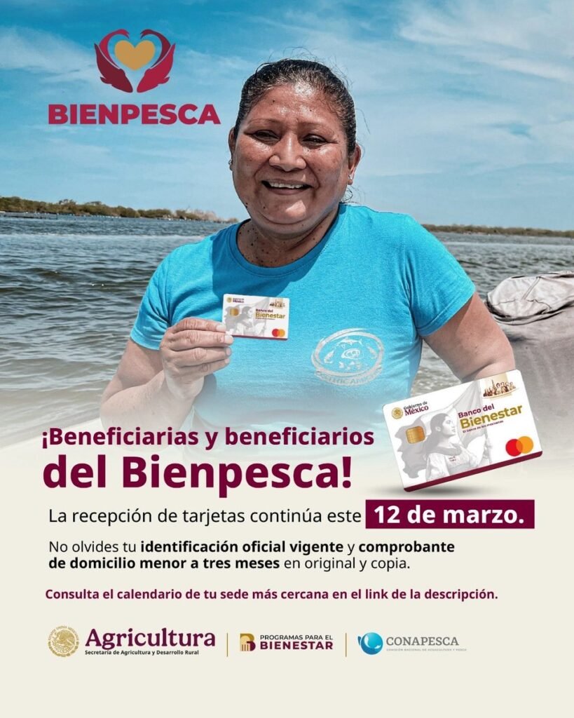 MÉRIDA, Yuc., a 11 de marzo de 2026.— La entrega de nuevas tarjetas del programa Bienpesca continúa en Yucatán, por lo que pescadores y beneficiarios del apoyo federal deberán acudir en los próximos días a las sedes habilitadas en distintos municipios del estado.
